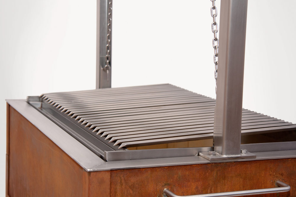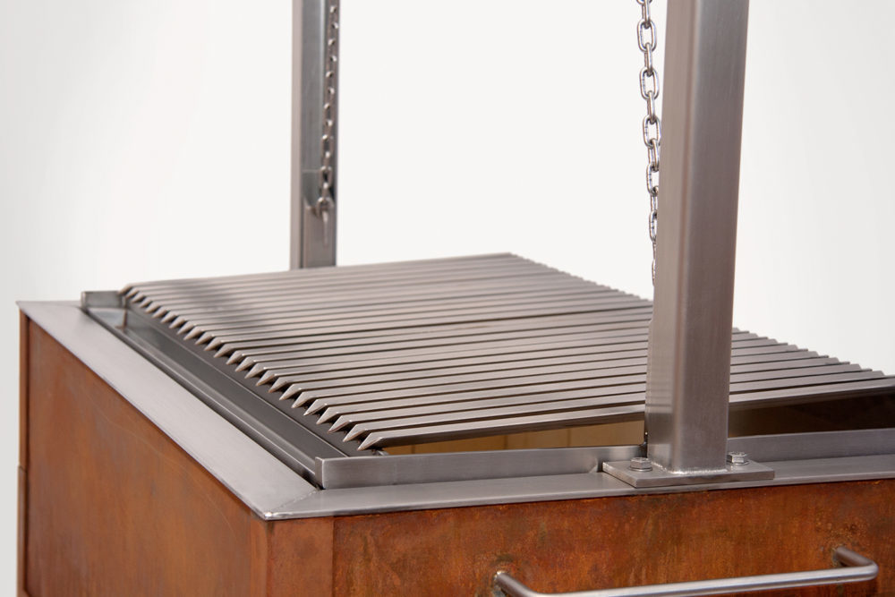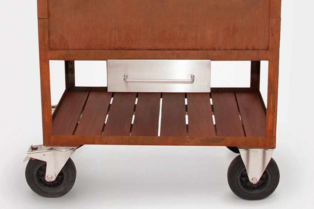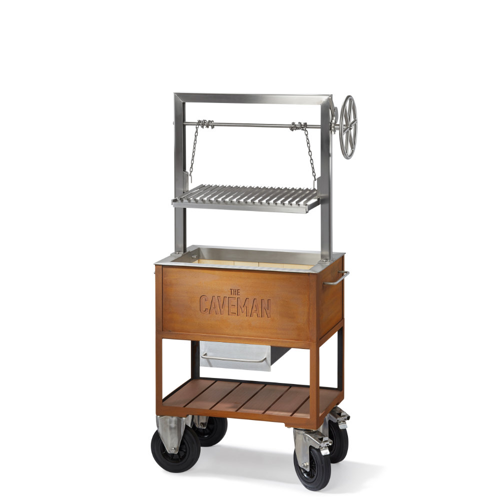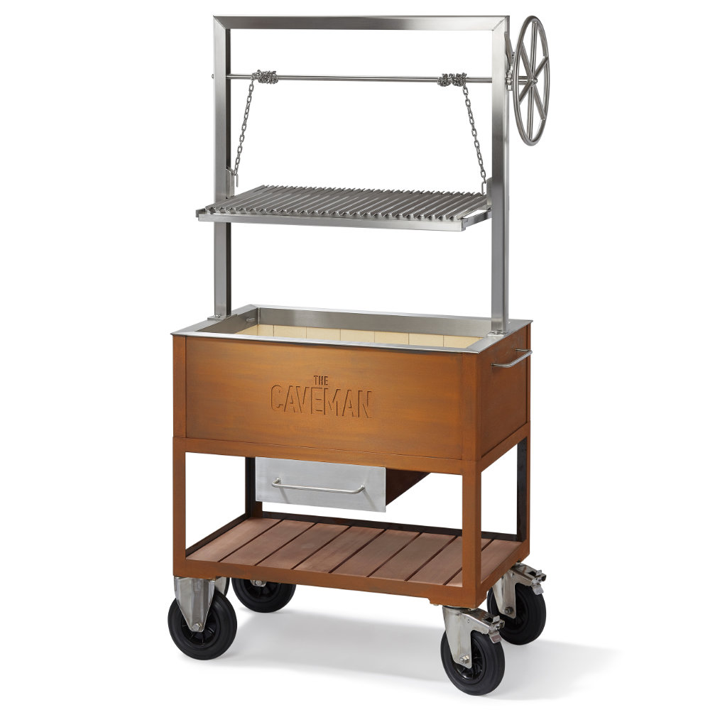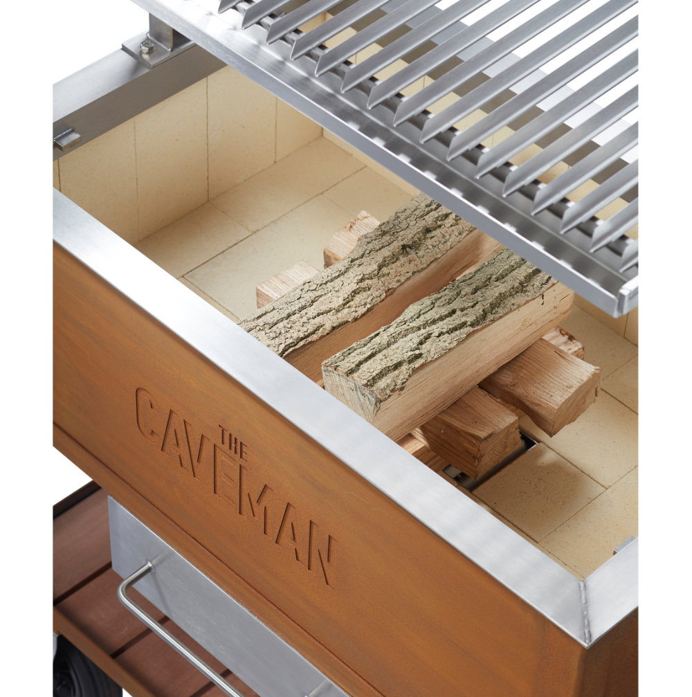 Les modèles extérieurs du Caveman Grill sont dotés d’un foyer et d’un châssis amovible fabriqué en acier Corten de 3 mm d’épaisseur, qui développe une couche protectrice lorsqu’il est exposé aux intempéries pour un aspect naturel de rouille. Les parties supérieures du grill, telles que le cadre et la grille de gril, sont fabriquées en acier inoxydable haute performance. Le cadre supérieur et la grille de gril sont amovibles pour un nettoyage facile, et le châssis à roues permet un mouvement facile.